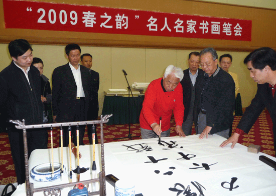 会议之后,北京世纪名人国际书画院还举行了“2009春之韵”名家书画笔会,苗培红副院长主持笔会。梁东副院长首先开笔书就了“荣怀六十载;戮力大中华”行书中堂,表达了对祖国的怀念和祝福。随后书画家们挥毫泼墨,即兴创作了书画作品30余幅,从不同侧面讴歌了新时期和谐盛世的暂新风貌。