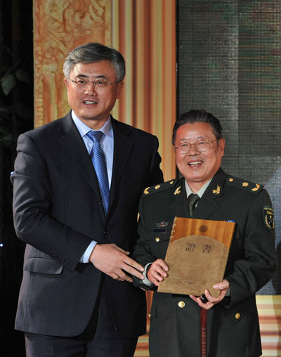 中国书协分党组书记赵长青 ( 左 ) 为 李铎 先生颁奖
