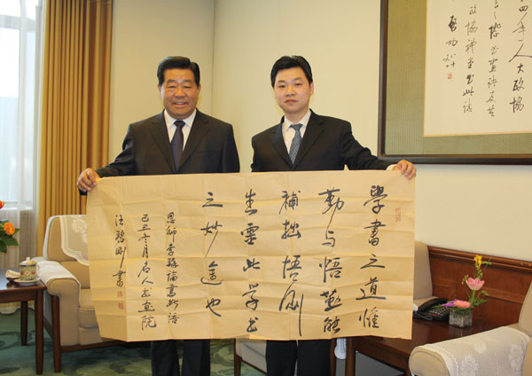 本院秘书长汪碧刚向贾庆林主席赠送自己的书法作品