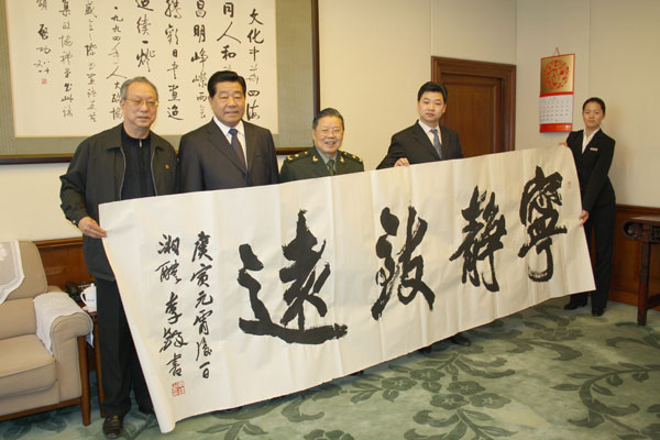 2010 年 3 月 10 日 下午 3 时,中共中央政治局常委、全国政协主席贾庆林(右二)亲切接见北京世纪名人国际书画院艺术顾问李铎(左二)、院长张道诚(左一)、秘书长汪碧刚(右一)并作重要指示。