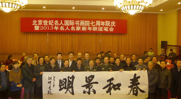 2013年1月13日,北京世纪名人国际书画院在全国政协礼堂举行名人书画院7周年院庆暨名人名家新年联谊笔会。名人书画院顾问、中央和国家机关部级领导陈士能、贾祥、高运甲,中国书协原顾问、首都师范大学中国书法文化研究院名誉院长欧阳中石,中国书协顾问、解放军书法创作院院长李铎;全国政协委员王铁成、陈醉、杨骥川,中国书协教育委员会副主任苗培红、中国书协理事朱守道、央视国际画院院长赵立凡、中国美协理事张松、中国书协理事张铜彦等名人书画院副院长;中国书协理事张杰、颜振卿,书法名家邹德忠、张有清、贾起家,北京中韩书画家联谊会会长赵勇,名人书画院副秘书长张维忠、彭一超、李小成、钱建恒,名人书画院中国画创作委员会秘书长陈培伦等首都名人名家100余人参加活动。全国青联委员、名人书画院副院长兼秘书长汪碧刚主持活动。