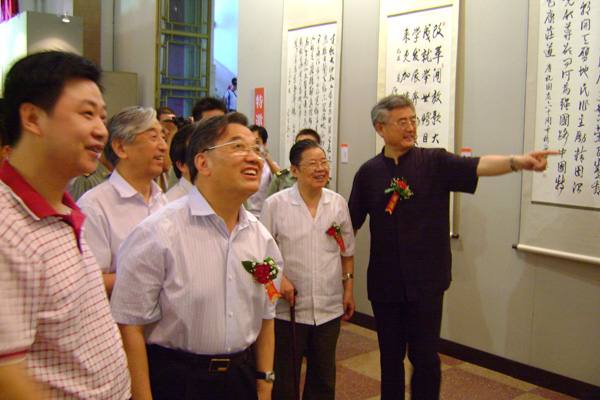 图为全国政协副主席李金华(左三)在中国书协顾问李铎(右二),中国书协主席张海(左二),中国书协分党组书记、驻会副主席兼秘书长主席赵长青(右一),中国书协会员、北京世纪名人国际书画院秘书长汪碧刚(左一)等陪同下兴致勃勃地观看展览。