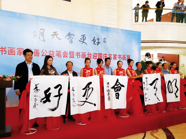 为喜迎65周年国庆,弘扬慈善文化,服务公共事务,促进书画艺术交流,为中华慈善总会“明天会更好”慈善爱心书画艺术交流基金筹集善款,支持在祖国贫困地区捐建“国兰慈善小学”。由中国教育网络电视台书画台、国际中国书画家交流促进会等单位倡议发起,携手中国楹联学会、北京书法院、北京世纪名人国际书画院共同举办的“明天会更好”百名书画家慈善公益笔会暨书画台迎国庆名家书画展开幕式,于2014年9月27日在中国教育网络电视台书画台举行。来自首都各界有关人士和书画家300余人参加了活动。