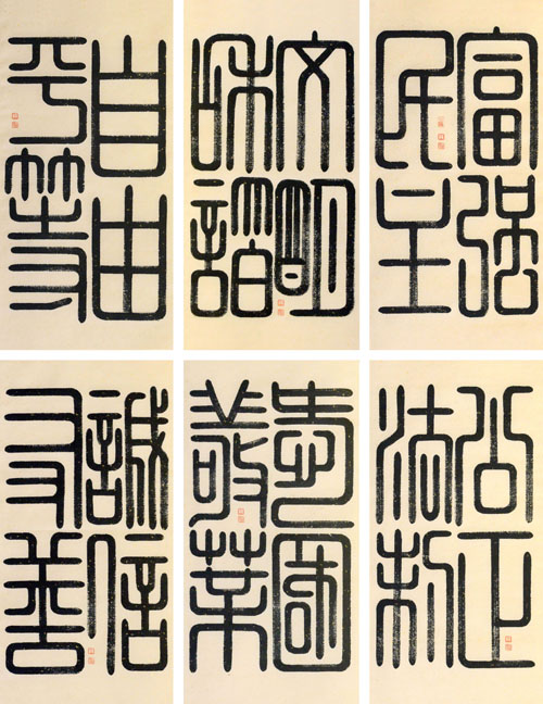 以书法的形式表现汉印,不可以简单论之,而是需要书法和篆刻的双重功底。这样才能显现整齐朴茂的风格。不然,有书法功底而缺乏驾驭能力,作品就会比例失调;有驾驭能力而笔墨不到位,作品就会游离于汉风。我之所以能够选择并专攻汉印书法,不仅是因为对汉印有过实践,还在于汉印书法吻合我的秉性——喜欢规矩做人,方正行事。
