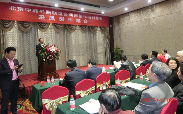 为更好的贯彻习近平主席在文艺工作座谈会上的讲话精神,坚持以人民为中心的创作导向,扎根基层,服务民众,提高书画家们创作技能,创作水平,2015年4月18日,北京中韩书画家联谊会河南创作培训基地在河南信阳中乐百花大酒店举行采风创作笔会活动。信阳市人大常委会原主任、信阳慈善总会会长姚铁璜、信阳市人大常委会副主任尹保斌、信阳市人大原副主任李全三、信阳市原政法委书记高俊峰、河南省政协常委、信阳市政协原副主席廖长明,信阳市委副秘书长郭体忠,统战部常务副部长佘南波,信阳市书协主席黄正连,以及特邀嘉宾中国书协第二、三届理事朱寿友、北京中韩书画家联谊会会长赵勇、世侨书画院院士魏鸿及河南省信阳地区书画家60余人参加了这场别开生面的采风创作笔会活动。赵勇、朱寿友、魏鸿等书画家前期到信阳的四望山、鸡公山、基督教堂等地进行了采风。笔会上,创作培训基地执行主任、信阳市知名企业联合会会长、信电集团董事长王胜伦、创作培训基地主任付后春、北京中韩书画家联谊会会长赵勇分别发言,对活动目的意义给予了高度评价。采风创作笔会由信阳电视台邢东升主任主持。