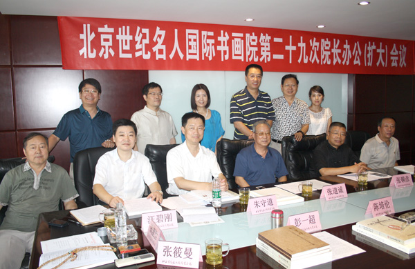 2015年8月29日上午,北京世纪名人国际书画院在京召开第二十九次院长办公(扩大)会议,全国政协原副秘书长、名人书画院院长张道诚,中国书协理事、全国人大司长、名人书画院副院长朱守道,中国书协理事、中国金融书协主席、名人书画院副院长张铜彦,全国青联委员、中国书协青少年委员会委员、名人书画院副院长兼秘书长汪碧刚,名人书画院副秘书长赵勇、彭一超、张筱曼、李小成、王巨亭、钱建恒,名人书画院中国画创作委员会秘书长陈培伦,名人书画院办公室主任刘欧祥等参加会议。