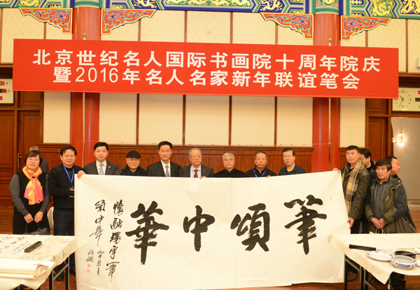 2016年1月10日,北京世纪名人国际书画院在全国政协礼堂隆重举行庆祝建院十周年活动,活动分为该院建院十周年座谈会和名人名家新年联谊笔会两个部分。中央和国家机关有关部门领导陈士能、田期玉、张道诚、王治国,解放军少将杨旭华、苏庆玉、史祥彬,中国书协顾问张飙,中国艺术研究院博士生导师陈醉,北京市人大常委会副秘书长李福祥,安徽省委统战部副部长孙丽芳,福建三明学院党委书记曾祥辉,知名书画家杨骥川、邹德忠、梁东、朱守道、赵立凡、张松、张铜彦、张维忠、颜振卿等近200人出席座谈会,名人书画院副院长兼秘书长汪碧刚主持座谈会。