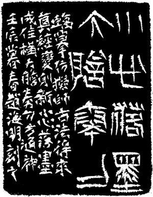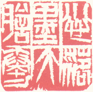 实践证明,“小心落墨,大胆奏刀”在篆刻过程中,二者是互为作用的。这种创作状态的培养是来源于娴熟的技法与综合能力的不断提升,相反技法与能力又是通过在最佳的状态下得以自然发挥的。初学篆刻者,由于主观条件的欠缺,技法、功力的薄弱,虽有激情,往往表现在“落墨”上失之准确,在“奏刀”上又过于拘谨放不开,以致反复修刀,造成章法布白走样,线条形感和质感失去精神。当具备一定篆刻功力后,章法布局,可以通过设计来解决,进而通过“大胆奏刀”提升篆刻线条的意蕴与精神。篆刻功力强者,二者一般都有较好的融合,达到篆刻者所追求的意境与个性的发挥。