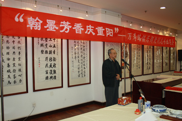 在简短的欢迎仪式上,张道诚院长在致辞中说,国庆节后迎来一年一度的重阳节,名人书画院组织书画家们专程来到中办老干部俱乐部举行书画笔会,慰问长期以来为党和国家建设事业做出重要贡献的老同志,以表达敬老、爱老、尊老的关爱之情。