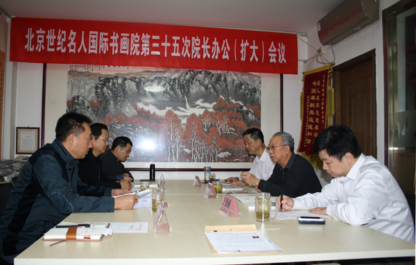 2017年10月28日,北京世纪名人国际书画院在京召开第35次院长办公(扩大)会议,学习贯彻了党的十九大精神,部署了近期工作。全国政协原副秘书长、名人书画院院长张道诚,第五、六届中国书协理事、名人书画院副院长朱守道,全国青联委员、第六届中国书协青少年工作委员会委员、名人书画院副院长兼秘书长汪碧刚,书画家、名人书画院副秘书长彭一超、李小成、王巨亭,名人书画院办公室主任刘欧祥等参加会议。