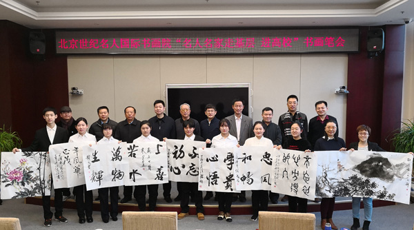 12月26日下午,2018年新年即将到来之际,北京世纪名人国际书画院组织书画家一行9人专程来到位于北京大兴区的北京政法职业学院,举办“名人名家走基层 进高校”书画笔会。全国政协原副秘书长、名人书画院院长张道诚,中国书协第四、五、六届理事、名人书画院副院长朱守道,全国青联委员、中国书协第六届青少年委员会委员、名人书画院副院长兼秘书长汪碧刚,中国书协理事、名人书画院副秘书长张维忠以及副秘书长赵勇、彭一超、李小成、钱建恒,名人书画院中国画创作委员会常委薛居波等参加活动,现场与学院师生进行书画交流,并向学院赠送书画作品。活动由北京政法职业学院院长许传玺主持,书画家的到来受到了学院师生的热烈欢迎。