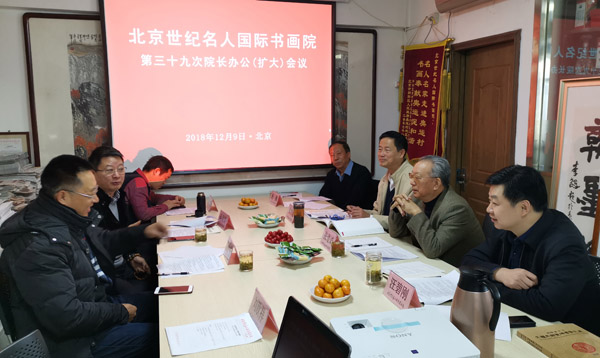2018年12月9日,北京世纪名人国际书画院在院部会议室召开第39次院长办公(扩大)会议,全国政协原副秘书长、名人书画院院长张道诚主持会议并讲话。中国书协第六届理事、中央国家机关书协副主席、名人书画院副院长朱守道,全国青联委员、中国书协第六届青少年工作委员会委员、名人书画院副院长兼秘书长汪碧刚,书画家、名人书画院副秘书长赵勇、彭一超、李小成、钱建恒,名人书画院办公室主任刘欧祥等参加会议。