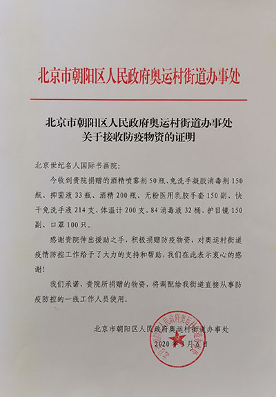 北京市朝阳区人民政府奥运村街道办事处接收北京世纪名人国际书画院捐赠的防疫物资证明。