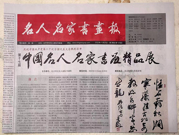 2022年12月26日,由北京世纪名人国际书画院主办的以“庆祝中国共产党第二十次全国代表大会胜利召开”为主题的第十七届中国名人名家书画精品展,亮相互联网,举办线上展览开幕式。九届全国政协副秘书长、名人书画院院长张道诚宣布展览开幕,参展书画名家、首都各界知名人士和书画爱好者百余人线上出席开幕式,全国青联委员、中国书协第六届青少年委员会委员、名人书画院副院长兼秘书长汪碧刚主持开幕式。