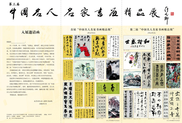 征稿日期截止2008年5月10日。拟于今年6月在北京举行第三届“中国名人名家书画精品展”。届时,邀请党和国家领导人、省部级领导、高级将领、名人名家和社会各界人士出席开幕式并参观展览;同时,编辑出版《第三届中国名人名家书画精品展作品集》。